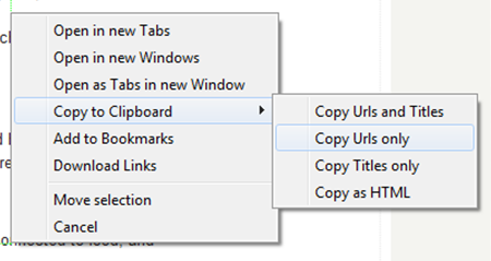 Keep pressing the right click button, then press the left click, then select "Copy URLs" -