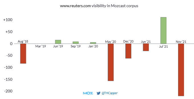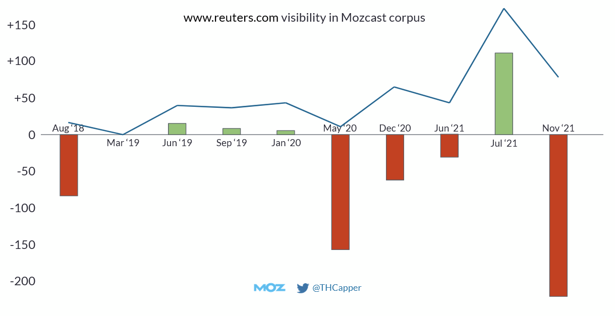 I should caveat: this is in the MozCast corpus only, not the general performance of Reuters. But still, these are real rankings, and each bar represents a Core Update where they have gone up or down. (Mostly, down.) They are not the only ones enjoying a bumpy ride, either.