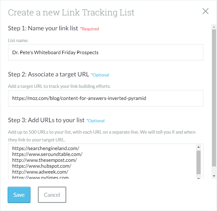 On the far-right, under the main header, click on "[+] Create new list." You'll get an overlay with a three-step form like the one below. Just give your list a name, provide a target URL (the page you want to track links to), and copy-and-paste in your list of prospects. Here's an example: