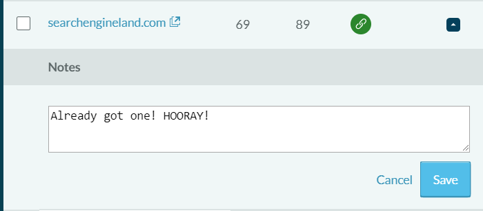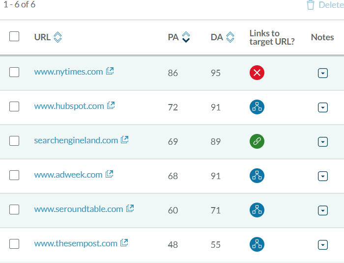 Alas, no link from the New York Times. The blue icons show me that the prospects are currently linking to moz.rainyclouds.online, but not to my target page. The green icon shows me that I've already got a head-start — Search Engine Land is apparently linking to this post (thanks, Barry!).