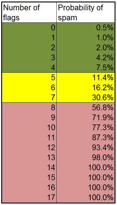 So this is an indication of percentile risk, not a "this is absolutely spam" or "this is absolutely not spam." The only caveat is anything with, I think, more than 13 flags, we found 100% of those to have been penalized or banned. Maybe you'll find an odd outlier or two. Probably you won't.