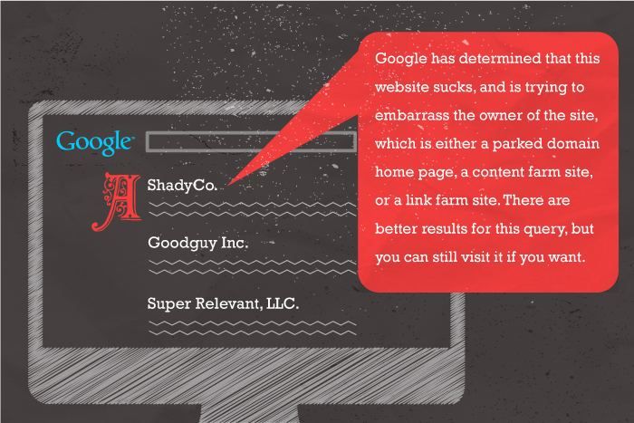 But imagine if you tried to visit your website in 2011, and instead of getting to the site, you received a Google warning that the page you were trying to visit was a content farm page or a link farm page, and it provided alternative pages to visit as well.