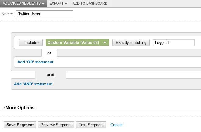 - You'll be prompted to select a name for your segment and to select which facets to base it on. We'll be using the Custom Variable slots that the Javascript tracking code uses. Analytics allows 5 Custom Variable slots, and the code above uses 4 of these (1 = Google, 2 = Google+, 3 = Twitter, and 4=Facebook) [side note: I think you could cram all these into 1 slot possibly]. We'll make a segment for each; here is how I setup my Twitter segment: