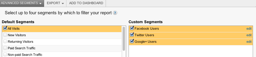 Once you have the tracking installed and segments setup you need to wait a few hours before you will see the first data appearing in Google Analytics. Once you have data coming in, the first step is to select which segments from your shiny new advanced segments you'd like to use: