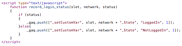 At Distilled's SearchLove conference in London back in October, Mat Clayton from Mixcloud provided a great snippet of Javascript that could be used to record whether visitors to your site were logged into Facebook or not. This has a few uses, such as customising which social buttons you show your user or just for recording how many of your users are logged in to Facebook and then using this to show your boss that you guys should really be interacting with your visitors there.