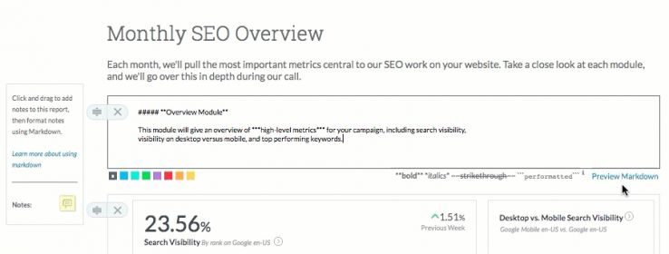 All-new custom formatting of those notes allows you to add in your preferred formatting — from headers to font formatting, to bullets, links, images, and more, using Markdown. Ensure that the stakeholders reading your reports know exactly what your work means and see the value of the SEO efforts you've been working on.