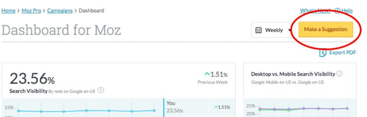 When you hop into a Campaign, you’ll notice a button on the top of your Dashboard that says “Make a Suggestion.” A click of this button will give you the power to tell us what you want to see. We love hearing from you and we're always looking for ways to iterate and improve our product for you so that your job as an SEO is as easy as possible.