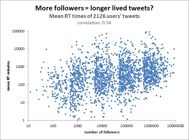 Here, I plot the average retweet time for all users against their follower counts. (Parenthetically, you can see the stratification I did for follower count... yes, we randomly sample, but first we put all Twitter users into buckets by how many follow them. This ensures we also sample from the relatively few high follower count users out there.)
