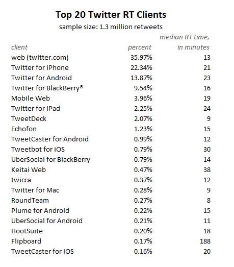 I also include the median time that users of that client made a retweet. A few things stand out. First, desktop clients are speedy little suckers: note that Tweetdeck and Twitter for Mac both have really fast times. Second, note that Flipboard, a sorta tweet curation service, has a slow response time, which makes sense given that it exposes tweets in report-like "what you missed" format.