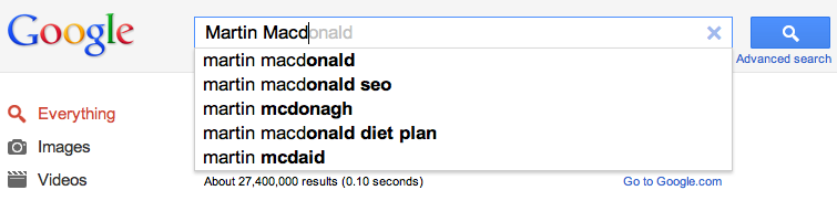 So, a few months back I began experimenting with search query volume in the results. My objective was fairly simple, and just involved trying to get “Martin Macdonald SEO” to be suggested when typing in “martin macd……”.