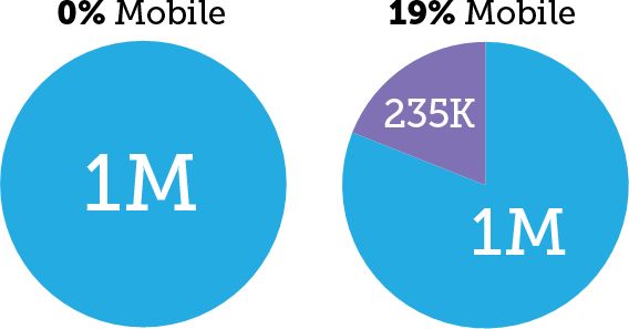 Look at it this way – let’s say we had a sample of 1M page views, and all of them came from desktop visitors. That would give us the pie on the left. Now, let’s say desktop holds steady at 1M page views, but mobile is now 19% of total views. This is what that reality would look like: