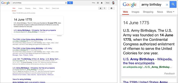 Let’s look at another SERP (“army birthday”) where the major elements are similar, but the screen space creates a different experience. In this case, we get one of the new answer boxes: