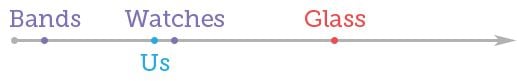 Let’s say we’re not quite halfway-ready for Glass. Stay with me – there’s a point to my crude line art. What about the wearables that aren’t quite as futuristic, including the wide array of fitness band options and the coming storm of smartwatches? Our perception now looks something like this…