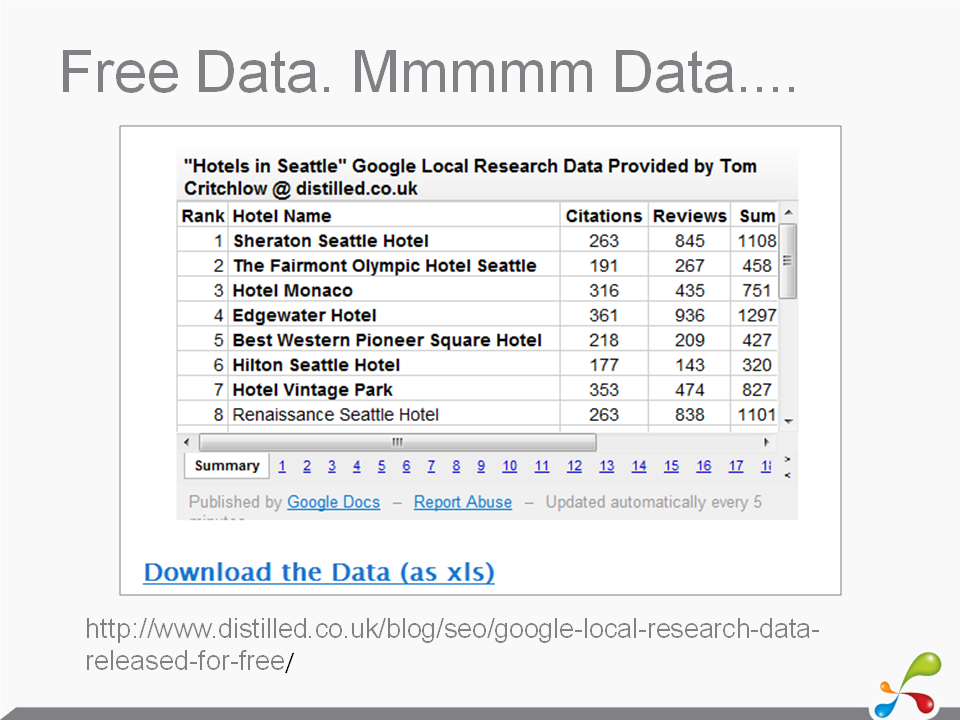 At the Seattle mozinar, I gave a presentation on "how to pitch SEO". One of my core themes was that the best way to win business is to avoid competitive pitches by giving yourself an unfair advantage. Being known for being smart is one of those advantages. If people get to know you through learning from your presentations, you will find yourself in a disproportionate number of uncompetitive pitches... Just sayin'.