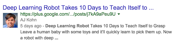 We already see this at work with Google+ posts in personalized (logged in) search. When I search for something that AJ Kohn has posted on Google+ while I'm logged in to my Google account, Google will elevate that result to my first page of results and even give it a good old-fashioned Authorship rich snippet! Google has high confidence that's a result I might want to see because AJ is in my circles, and my interactions with him and his content show that he is probably very relevant and useful to me. Good guess, Google, you're right!