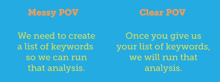 The most common mistake I see is for the writer to get indecisive with the pronouns and start throwing around the word "we" as in "we need to fix your title tags." Which could mean that the consultant is taking responsibility for the title tags, or it could be a general suggestion that the title tags need fixing.