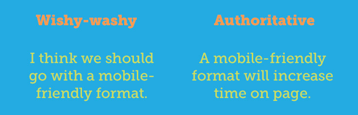 Being assertive doesn't mean you should stand on your desk and shout your opinions like you're auditioning to be the next Hulk. Instead, have confidence in the data and recommendations you're reporting and convey that confidence in your writing. Because if you're not confident, you might not be ready to write the report. So go double-check your research and then use the following tactics to sound like the authority you are: