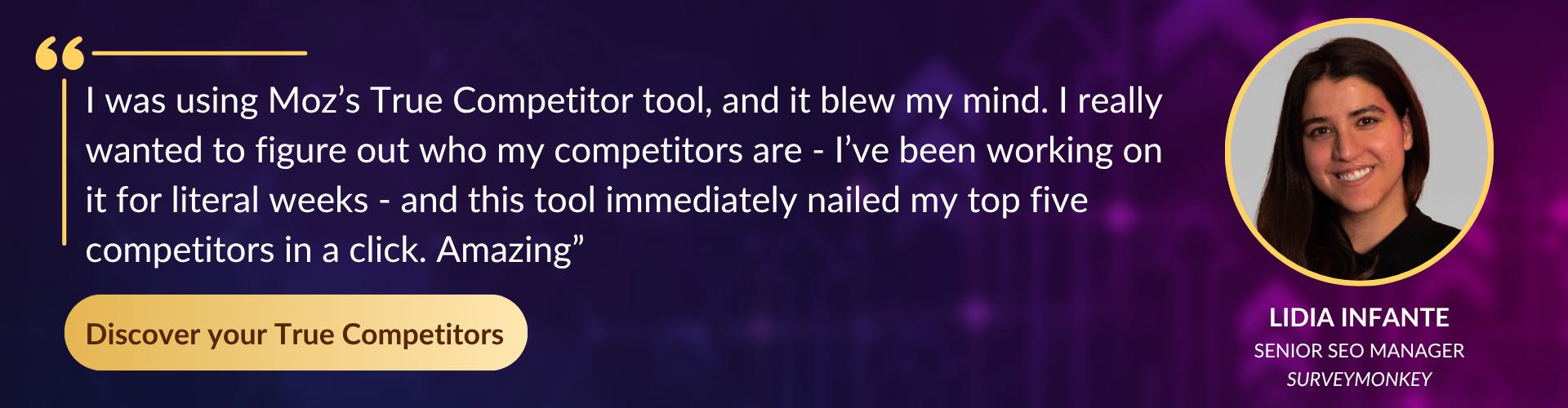 Your SEO competitors are brands that are organically ranking in the top spots for your target keywords. Moz's True Competitor tool makes identifying your competitors and simple and quick task: