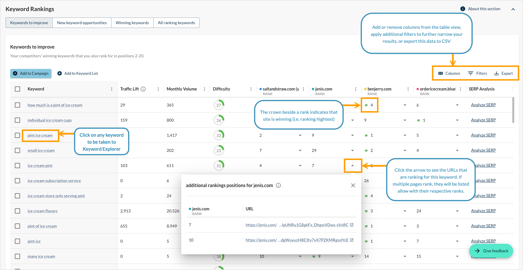 - Winning keywords — The keywords where you are outranking your competitors. Keep an eye on these keywords to make sure you don’t lose ground!