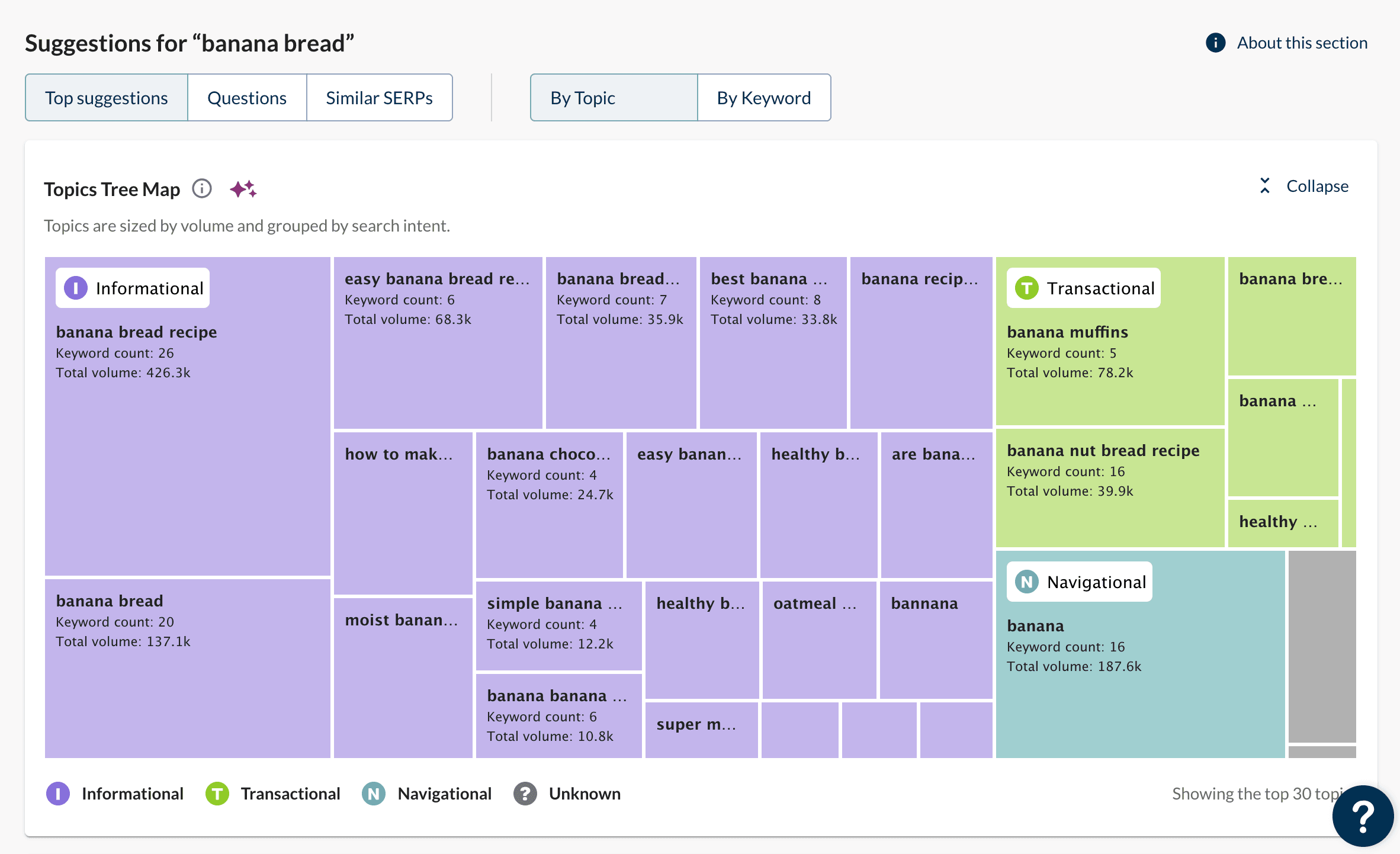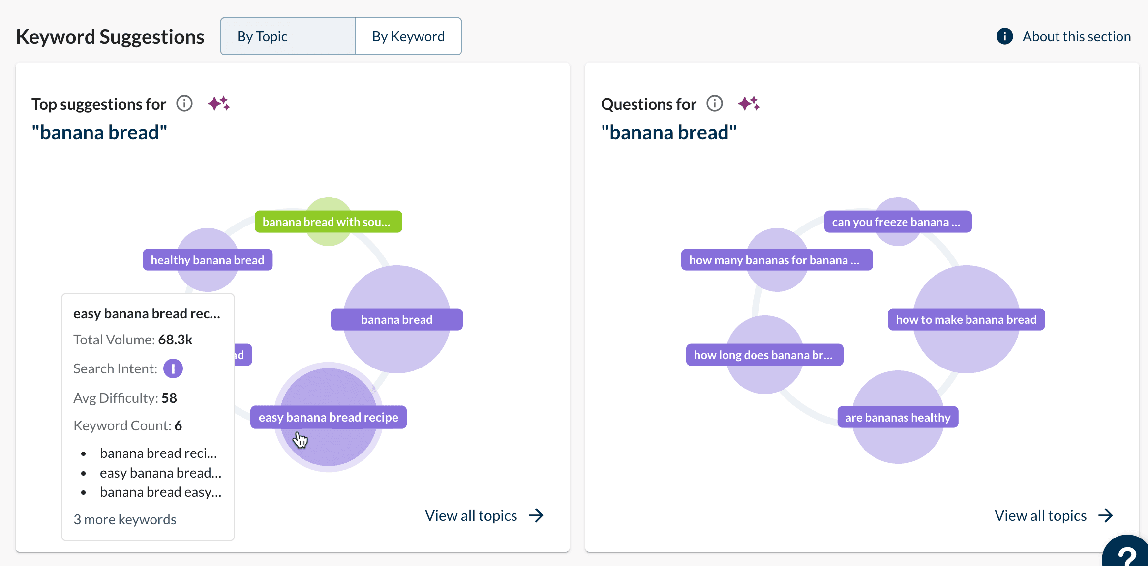 To get started, head to Keyword Explorer and enter any keyword. You can then explore the Top suggestions and Questions for your keyword by topic.
